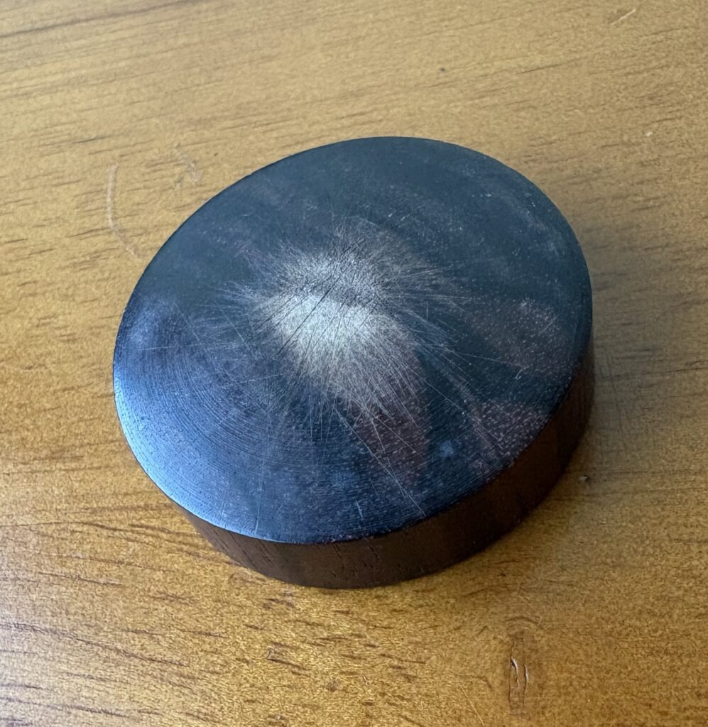 リードをある程度削ったら、黒く丸い黒檀でできた、カッティングブロックという道具が必要です。